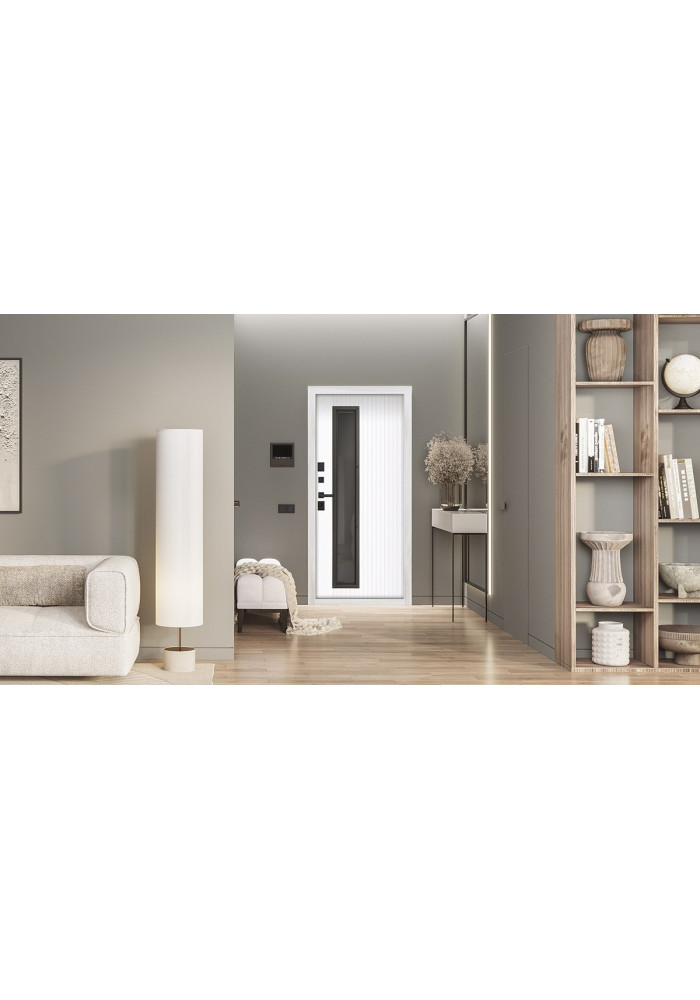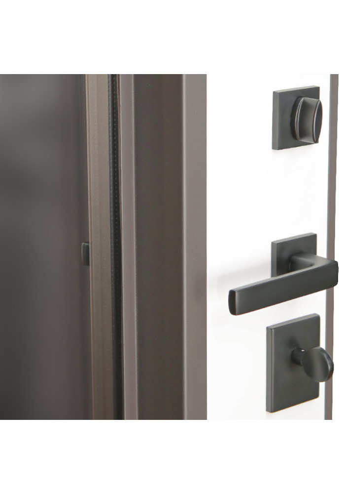 • Внутренняя отделка: Панель МДФ 16 мм. Цвет «белый матовый». Объемная фрезеровка. Прижимная рамка 30мм (покраска в цвет двери). Стеклопакет тонированный.
