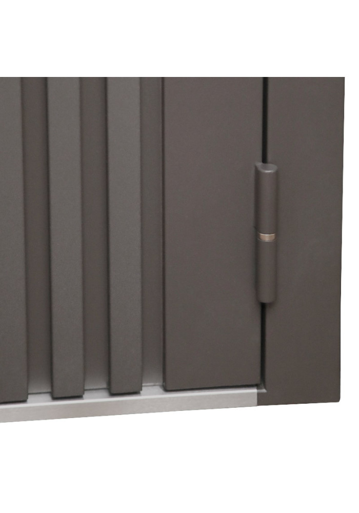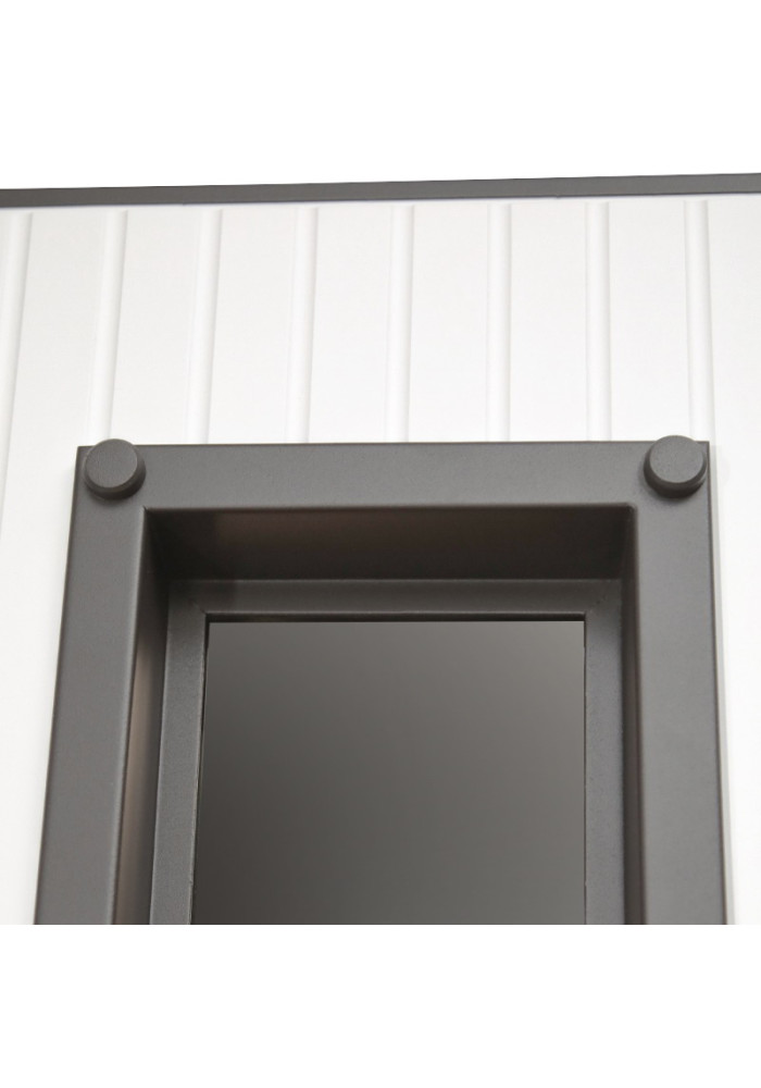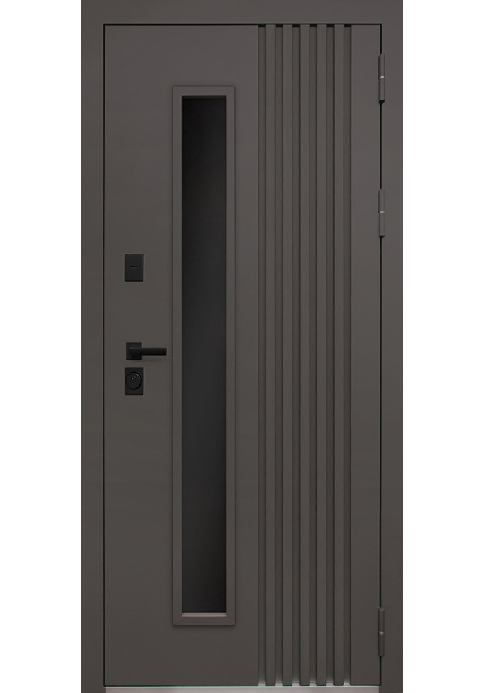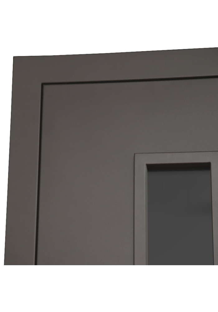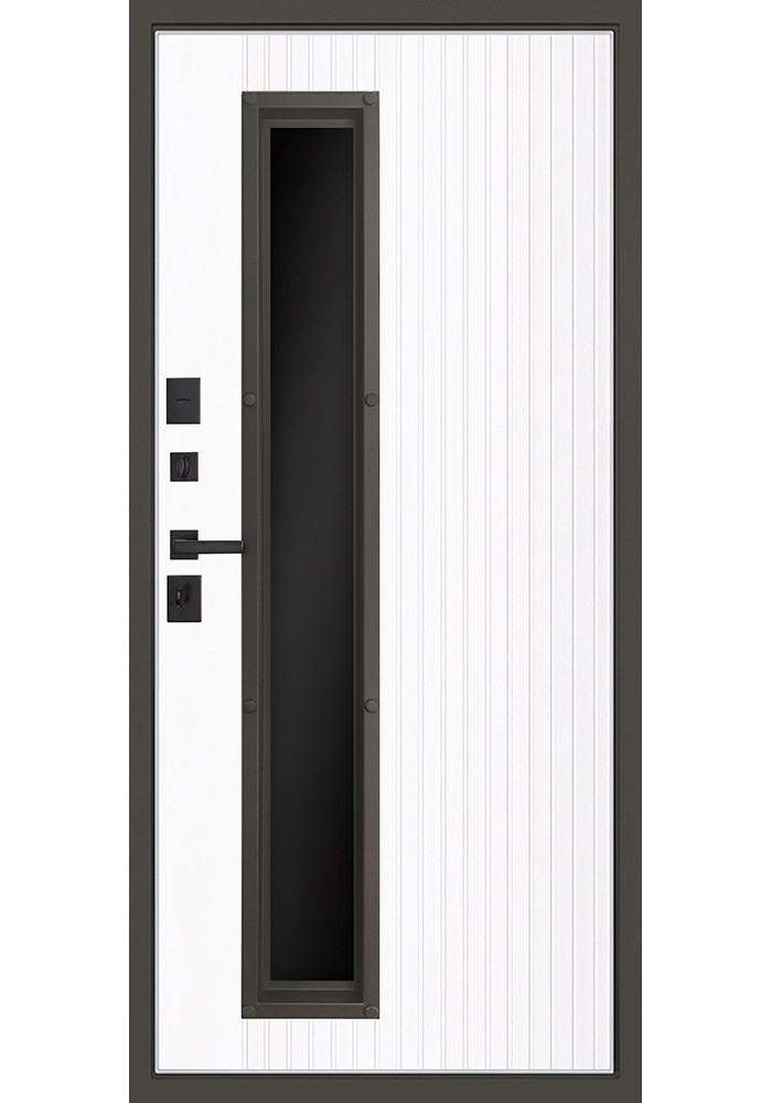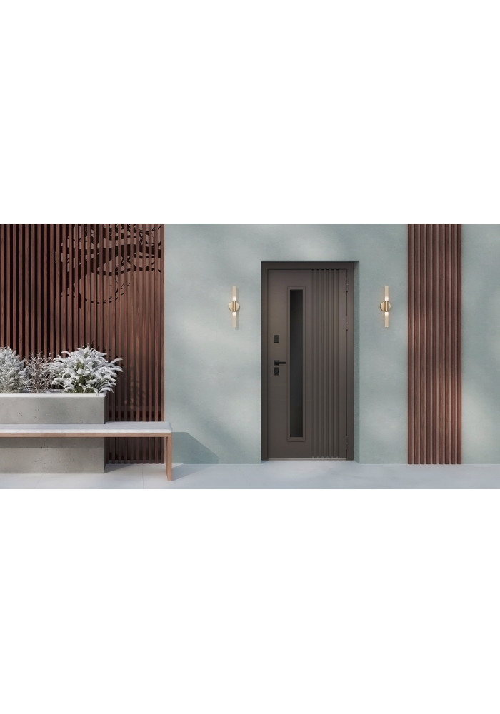 • Наружный лист металла: Лист металла 1,8 мм. Вертикальные рейки из металла. Два слоя покрытия. Тонированный двухкамерный стеклопакет. Наличник гладкий.